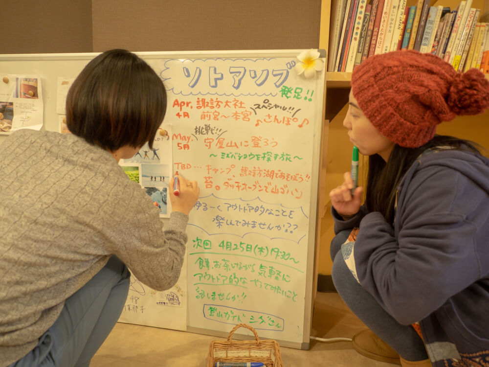 長野に来たのに長野の楽しみ方がわからないアウトドア初心者のOLのお二人、ゆみこさんとまりこさんに長野の楽しみ方をどうやって伝えるか考えようという打ち合わせです。
